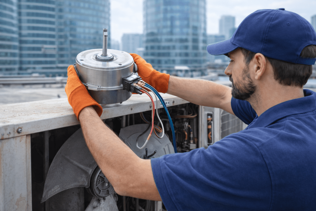The outdoor fan motor plays a critical role in your AC system by pushing heat away from the condenser coil. If the fan motor becomes weak or stops working, your AC may overheat, reduce cooling performance, or shut down completely.